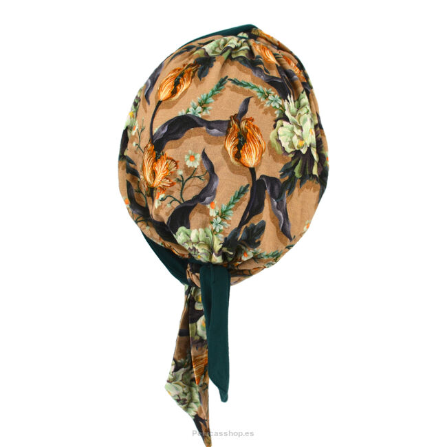 Turbante estampado confeccionado con un material ligero, suave y agradable al tacto. El turbante es reversible, lo que permite cambiar el aspecto del cubrecabezas.